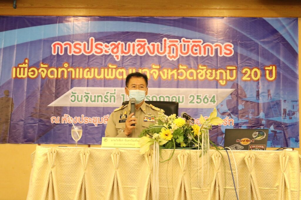 วันที่ 12 กรกฎาคม 64 การประชุมเชิงปฏิบัติการเพื่อจัดแผน 20 ปี จังหวัดชัยภูมิ ณ ห้องประชุมลีลาวดี โรงแรมสยามริเวอร์รีสอร์ท อำเภอเมืองชัยภูมิ จังหวัดชัยภูมิ โดยมีนายวิเชียร จันทรโณทัย ผู้ว่าราชการจังหวัดชัยภูมิ เป็นประธานการประชุม
