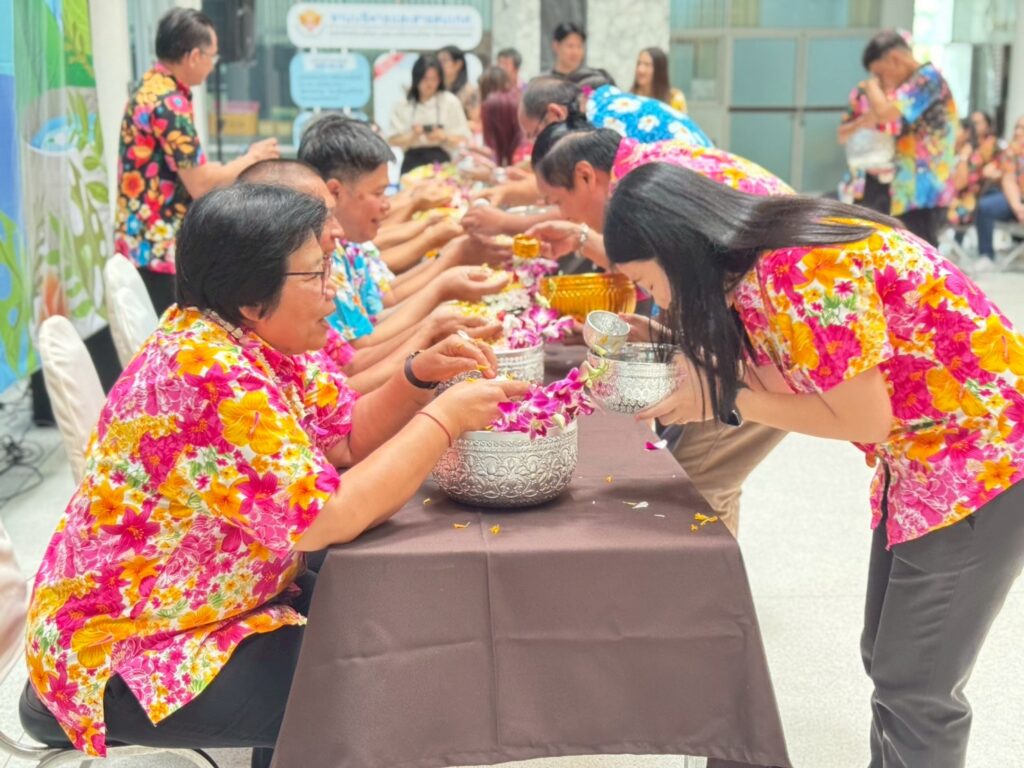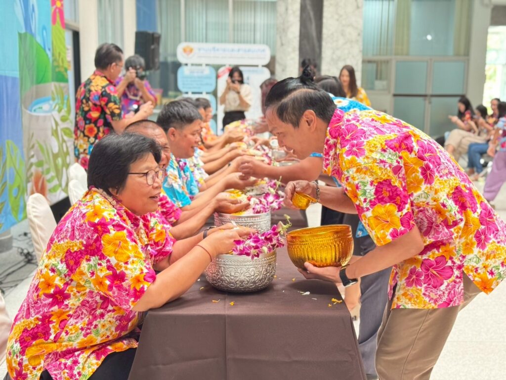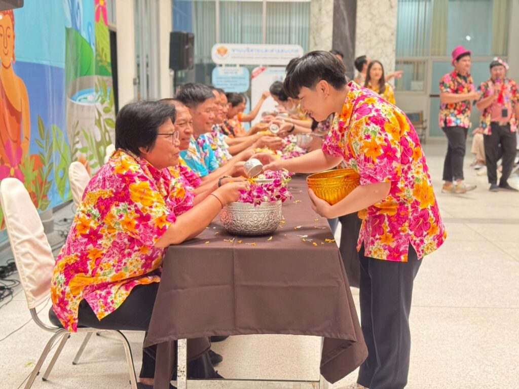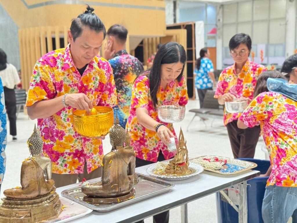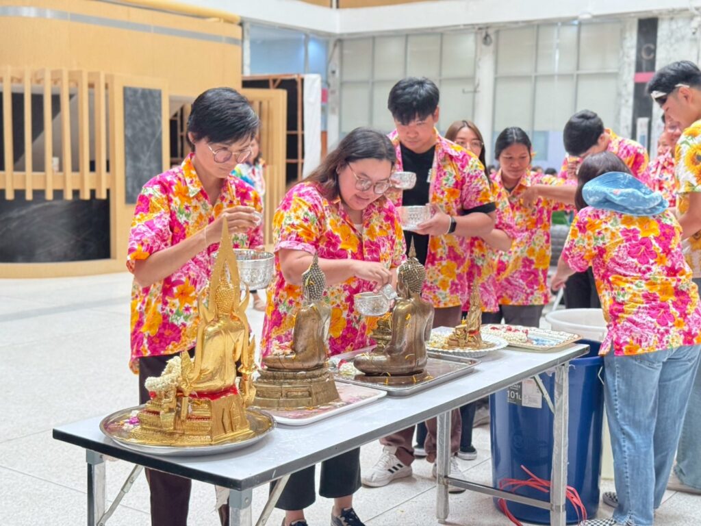 ภายในงานมีพิธีสรงน้ำพระพุทธรูปเพื่อความเป็นสิริมงคล และพิธีรดน้ำขอพรผู้บริหารและบุคลากรอาวุโส แสดงถึงความเคารพและกตัญญูตามขนบธรรมเนียมไทยอย่างงดงาม ซึ่งได้รับเกียรติจากรศ.ดร.ลำปาง แม่นมาตย์ ผู้อำนวยการสถาบันฯ กล่าวอวยพรแก่ชาวอาคารพิมล กลกิจ เนื่องในวันสงกรานต์