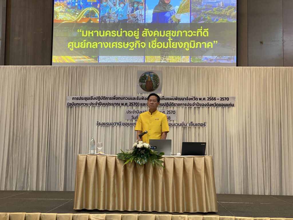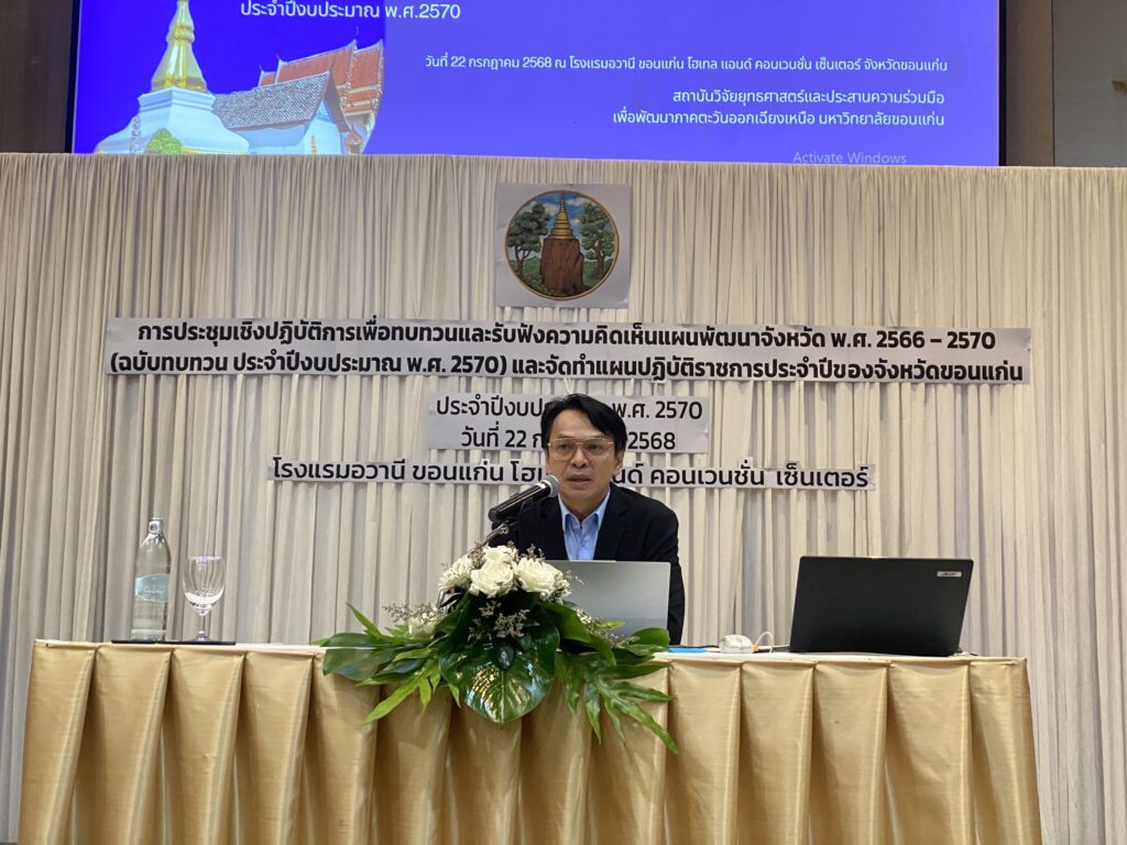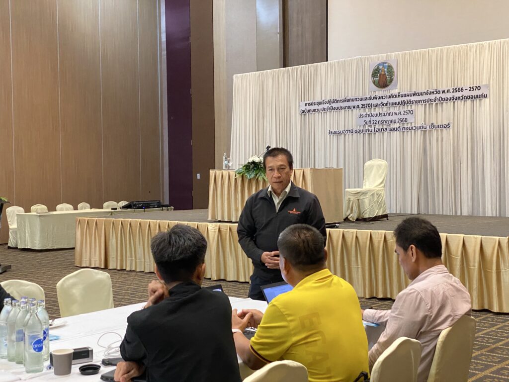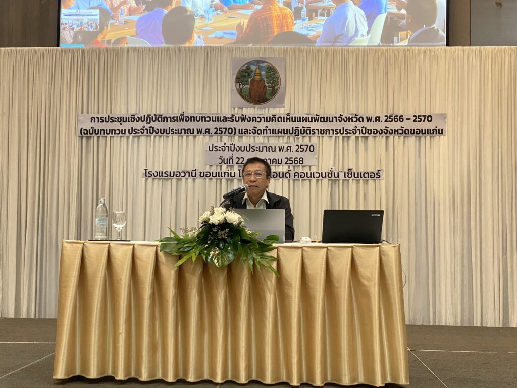 เมื่อวันที่ 22 กรกฎาคม 2568 สถาบันวิจัยยุทธศาสตร์และประสานความร่วมมือเพื่อพัฒนาภาคตะวันออกเฉียงเหนือ มหาวิทยาลัยขอนแก่น (สยปพ.มข.) นำทีมโดย นายเกรียงศักดิ์ ภูศรีโสม รองผู้อำนวยการฝ่ายบริหาร ดร.อนุวรรตน์ ศรีสวัสดิ์ รองผู้อำนวยการฝ่ายยุทธศาสตร์และพัฒนาพื้นที่ และนางสาวกนกพร นามพวน ผู้ประสานงานโครงการ ร่วมเป็นวิทยากรในการทบทวนและรับฟังความคิดเห็นแผนพัฒนาจังหวัดขอนแก่น พ.ศ. 2566-2570 (ฉบับทบทวน ประจำปีงบประมาณ พ.ศ. 2570) และจัดทำแผนปฏิบัติราชการประจำปีของจังหวัดขอนแก่น ประจำปีงบประมาณ พ.ศ. 2570 โดยได้จัดขึ้นที่ โรงแรมอวานี ขอนแก่น โฮเทล แอนด์ คอนเวนชั่น เซ็นเตอร์ จังหวัดขอนแก่น