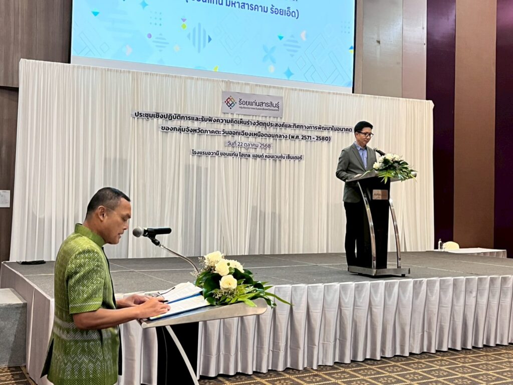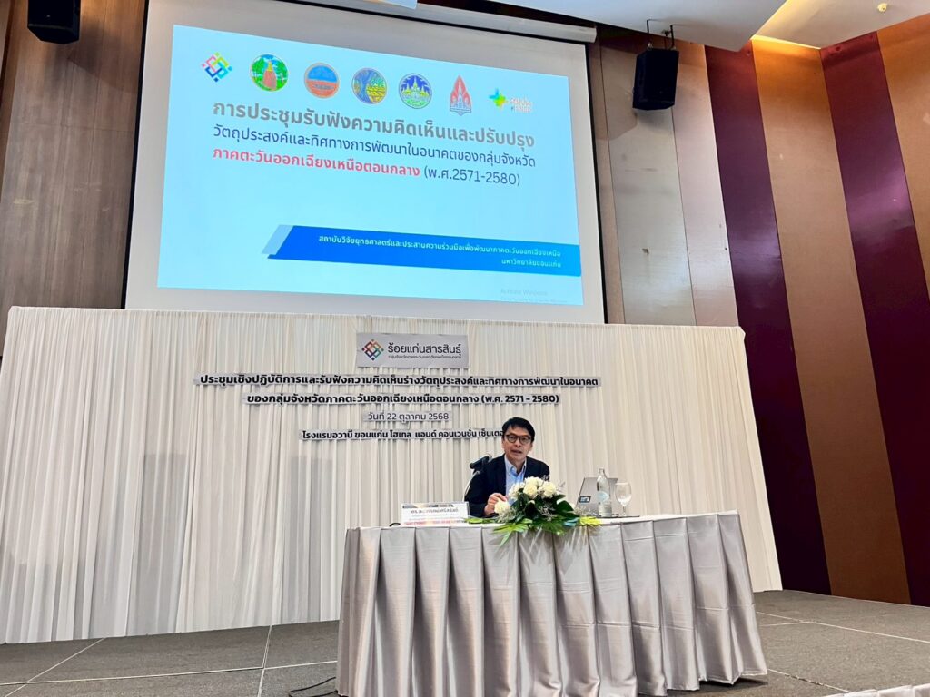 วันที่ 22 ตุลาคม 2568 สถาบันวิจัยยุทธศาสตร์ประสานความร่วมมือเพื่อพัฒนาภาคตะวันออกเฉียงเหนือ มหาวิทยาลัยขอนแก่น นำโดย รองศาสตราจารย์ ดร.ลำปาง แม่นมาตย์ ผู้อำนวยการสถาบันวิจัยยุทธศาสตร์ฯ ดร.อนุวรรตน์ ศรีสวัสดิ์ รองผู้อำนวยการสถาบันวิจัยยุทธศาสตร์ฯ ดร.สริญญา ลัทธิ์ถีระสุวรรณ และนายเกรียงศักดิ์ ภูศรีโสม นำทีมสถาบันวิจัยยุทธศาสตร์ฯ ร่วมเป็นวิทยากรการประชุมปรึกษาหารือเพื่อรับฟังความคิดเห็นและปรับปรุงการจัดทำวัตถุประสงค์และทิศทางการพัฒนาในอนาคตของกลุ่มจังหวัดภาคตะวันออกเฉียงเหนือตอนกลาง (พ.ศ.2571-2580) ณ ห้องประชุมคอนเวนชั่น โรงแรมอาวนี ขอนแก่น โฮเทล แอนด์ คอนเวนชั่น เซ็นเตอร์